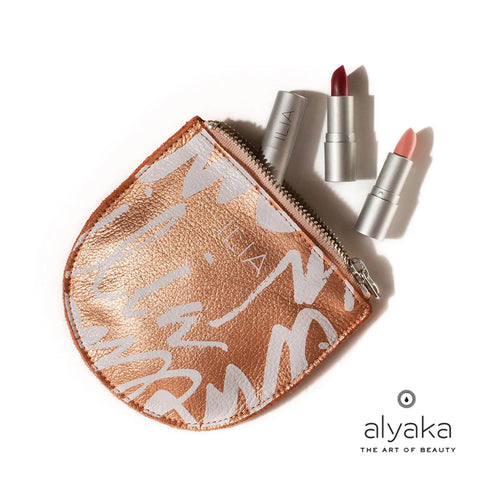This Limited Edition BAGGU copper pouch has 3 of ILIA Beauty’s top-selling lip colours, packed in a soft half-moon pouch made from naturally milled leather and comes with a metallic copper finish.