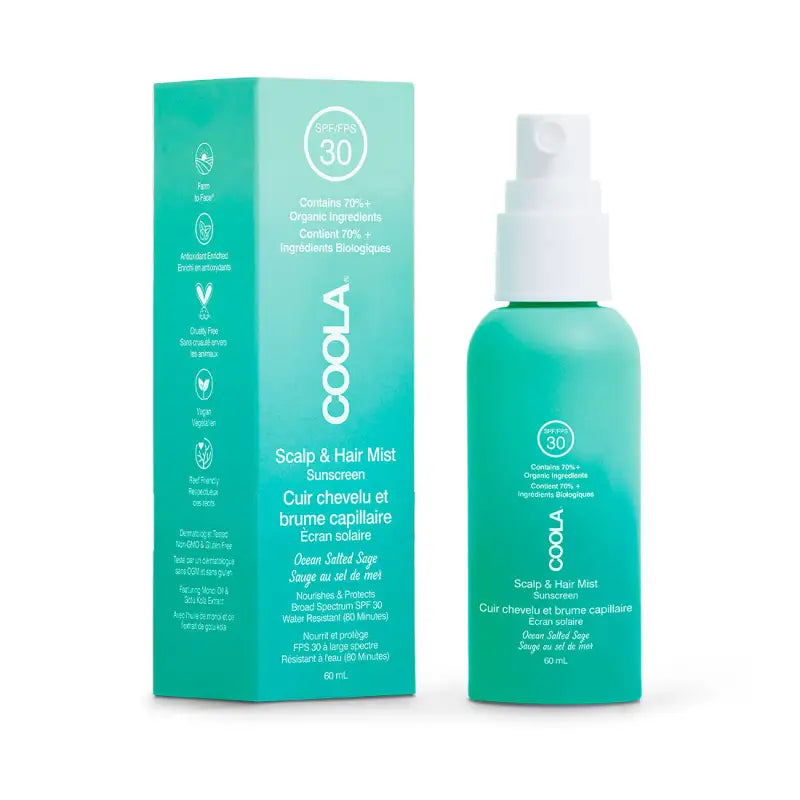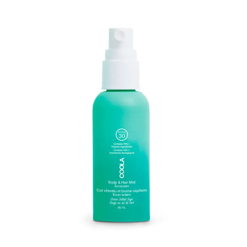 Just a heads upCoola's organic scalp and hair sunscreen with SPF 30 protects those often-forgotten spots. This water-resistant SPF mist doesn't weigh hair down or leave it looking greasy. Packed with colour-protecting ingredients, this ocean-scented sunscreen spray also helps prevent UV-related colour fade.