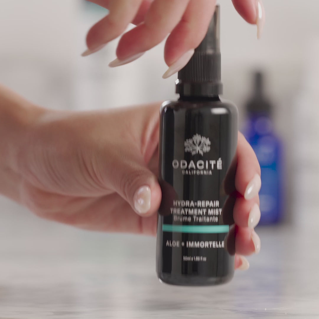 Odacite Aloe & Immortelle Hydra-Repair Treatment Mist refreshes, hydrates, and repairs skin.