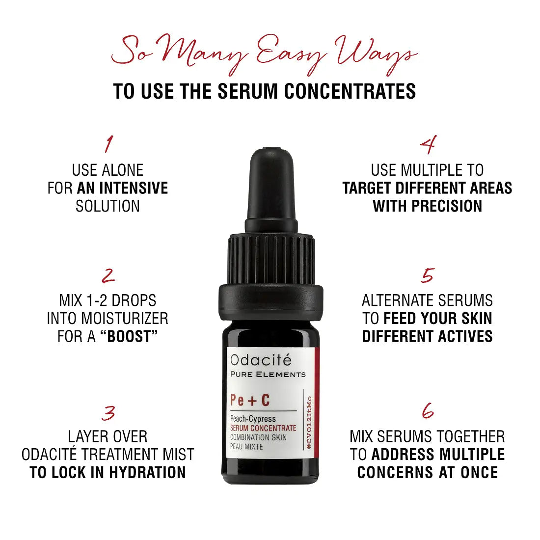 Apply 3 drops of Odacite Pe+C Combination Skin Serum Concentrate directly to clean, dry skin for intensive benefits. Or, mix 2-3 drops with your favorite lotion, and massage in until absorbed. Repeat Odacite Pe+C Combination Skin Serum Concentrate twice daily.
