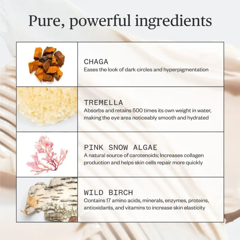 - Tremella: Absorbs and retains 500 times its own weight of water, making the eye area noticeably smooth and hydrated.